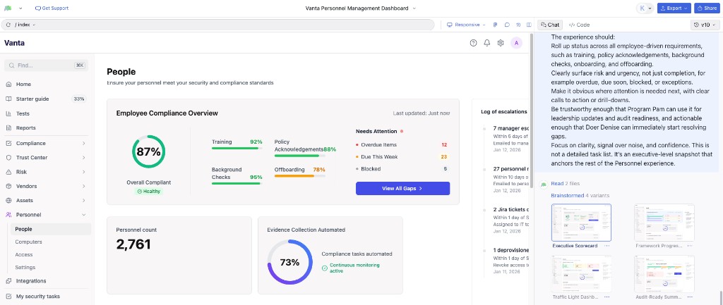 She tried using other AI prototyping tools to move faster. They were slow and produced generic outputs that didn’t resemble Vanta’s product. Instead of exploring new ideas, she was stuck trying to clean up what the tools generated.